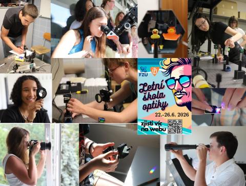 Letní škola optiky 2025 probíhá v termínu od 22. 6. do 26. 6. 2026 s kapacitou 30 studentů. V tomto týdnu se studenti dozví základní informace ze stěžejních oblastí optiky: šíření světla, difrakce světla, lom světla, interference, konstrukce optických přístrojů, mikroskopie, lasery, měření spektra. Formou devíti jednoduchých pokusů, které jsou nachystané v našich laboratořích, si studenti budou moci se světlem a s optikou vlastnoručně pohrát. Podrobnosti naleznete v záložce Témata červen.